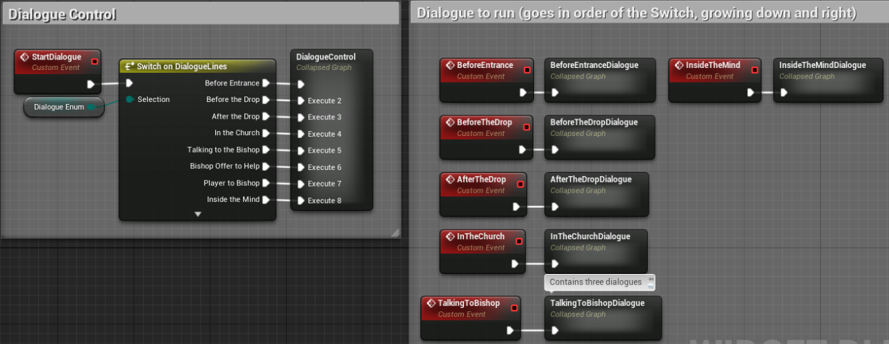 This is dialogue system works via several different blueprints that all tie into the behaviour tree, inputs via the UI elements progress though the conversations.